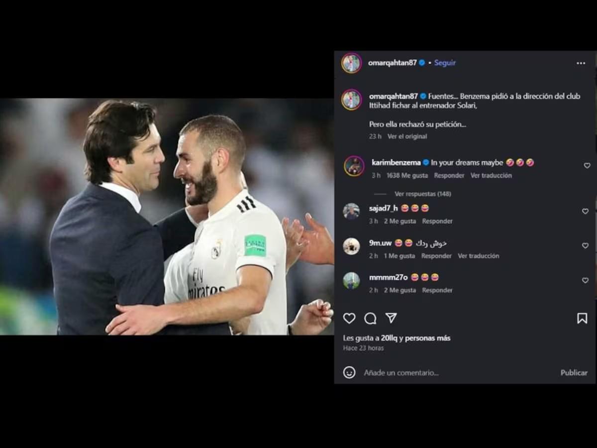 吉达联合在输给利雅得胜利后,解雇了主教练布兰科。有媒体和记者报道称,本泽马要求吉达联合任命索拉里为主帅,本泽马在社媒回击了这些传闻。